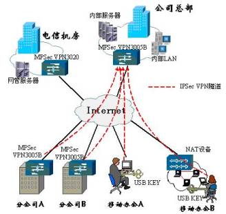 迈普提供了构建IPSec VPN网的相关产品及完整的系统解决方案,提供MPSec VPN系列VPN网关,安全路由器系列以及应用于PC的VRC软件(VPN远程客户端软件),同时迈普公司提供具有零初始配置的安全网络管理系统和证书管理系统(MPSec CMS)。利用迈普公司提供的各种VPN功能组件,用户可以根据自己的企业网络规模选择合适的设备和管理系统,从而利用廉价的Internet平台构建自己的虚拟专用网络,