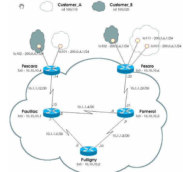 本文档使用下面的拓扑图,网络中有3 台P 路由器、2 台PE 路由器(Pescara 和Pesaro),2 个